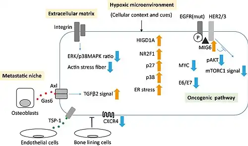 Une mutation motrice est une mutation au sein d’un gène qui joue un rôle essentiel dans le développement et la progression du cancer. Le blocage de la voie de la mutation motrice est la base de la thérapie par ciblage moléculaire. Les cellules de patients atteints d'un cancer du poumon non à petites cellules présentant des mutations du récepteur du facteur de croissance épidermique peuvent être dormantes dans des conditions hypoxiques[44]. La signalisation intracellulaire du récepteur du facteur de croissance épidermique est supprimée en dormance, alors que la phosphorylation constitutive du récepteur du facteur de croissance épidermique est maintenue.