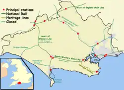 Il existe également une ligne locale, la Heart of Wessex Line (en), qui relie Weymouth à Bristol. Plus anecdotiquement, la Swanage Railway (en) est un chemin de fer touristique qui relie les gares de Wareham (en) et Swanage (en).