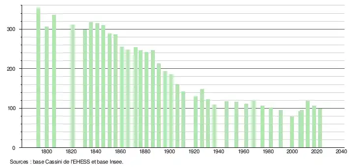 L'évolution du nombre d'habitants est connue à travers les recensements de la population effectués dans la commune depuis 1793. Pour les communes de moins de 10 000 habitants, une enquête de recensement portant sur toute la population est réalisée tous les cinq ans, les populations de référence des années intermédiaires étant quant à elles estimées par interpolation ou extrapolation[12]. Pour la commune, le premier recensement exhaustif entrant dans le cadre du nouveau dispositif a été réalisé en 2007[13].