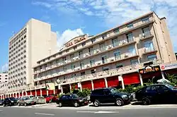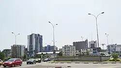 ![]() ![]() ![]() ![]() De haut en bas, de gauche à droite : le Boulevard de la liberté, la Cathédrale Saint-Pierre-et-Saint-Paul, la Chambre de commerce, le Palais des rois Bell et le Sud Obelisk, l'Akwa Palace et le Monument funéraire des rois Bell. |