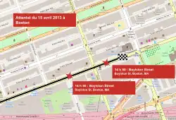 Une première explosion a lieu le 15 avril 2013 vers 14 h 50 sur Boylston Street, dans le quartier de Back Bay, à quelques mètres seulement de la ligne d'arrivée du 117e marathon de Boston[1], près de Copley Square. Elle survient sur la gauche des coureurs qui terminent cet important marathon organisé annuellement dans la ville et dont l'édition en cours est dédiée à la mémoire des victimes de la tuerie de l'école primaire Sandy Hook, le dans le Connecticut voisin. Elle affecte surtout le public massé derrière des barrières face au bâtiment principal de la bibliothèque publique de Boston, mais aussi au moins un coureur de 78 ans, Bill Iffrig, envoyé au sol par la déflagration. À cet instant, la majorité des quelque 27 000 participants ont d'ailleurs déjà franchi la ligne d'arrivée. Les vainqueurs de l'épreuve, Lelisa Desisa[9] chez les hommes et Rita Jeptoo chez les femmes, ont terminé leur course depuis plus de deux heures[9].