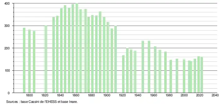 L'évolution du nombre d'habitants est connue à travers les recensements de la population effectués dans la commune depuis 1793. Pour les communes de moins de 10 000 habitants, une enquête de recensement portant sur toute la population est réalisée tous les cinq ans, les populations de référence des années intermédiaires étant quant à elles estimées par interpolation ou extrapolation[20]. Pour la commune, le premier recensement exhaustif entrant dans le cadre du nouveau dispositif a été réalisé en 2008[21].