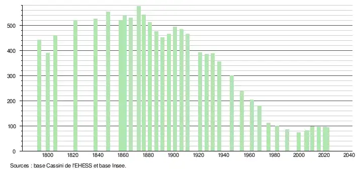 L'évolution du nombre d'habitants est connue à travers les recensements de la population effectués dans la commune depuis 1793. Pour les communes de moins de 10 000 habitants, une enquête de recensement portant sur toute la population est réalisée tous les cinq ans, les populations de référence des années intermédiaires étant quant à elles estimées par interpolation ou extrapolation[16]. Pour la commune, le premier recensement exhaustif entrant dans le cadre du nouveau dispositif a été réalisé en 2005[17].