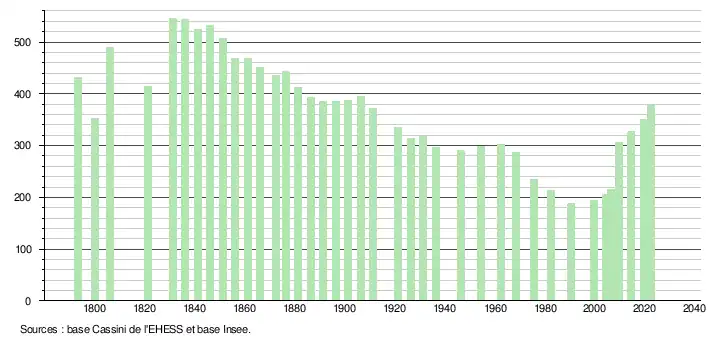 L'évolution du nombre d'habitants est connue à travers les recensements de la population effectués dans la commune depuis 1793. Pour les communes de moins de 10 000 habitants, une enquête de recensement portant sur toute la population est réalisée tous les cinq ans, les populations de référence des années intermédiaires étant quant à elles estimées par interpolation ou extrapolation[24]. Pour la commune, le premier recensement exhaustif entrant dans le cadre du nouveau dispositif a été réalisé en 2004[25].