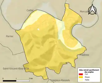 Le retrait-gonflement des sols argileux est susceptible d'engendrer des dommages importants aux bâtiments en cas d’alternance de périodes de sécheresse et de pluie. 88,7 % de la superficie communale est en aléa moyen ou fort (67,7 % au niveau départemental et 48,5 % au niveau national). Sur les 480 bâtiments dénombrés sur la commune en 2019, 459 sont en aléa moyen ou fort, soit 96 %, à comparer aux 72 % au niveau départemental et 54 % au niveau national. Une cartographie de l'exposition du territoire national au retrait gonflement des sols argileux est disponible sur le site du BRGM[22],[Carte 2].