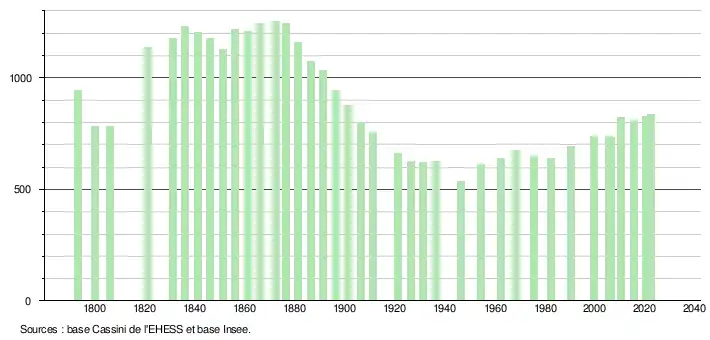 L'évolution du nombre d'habitants est connue à travers les recensements de la population effectués dans la commune depuis 1793. Pour les communes de moins de 10 000 habitants, une enquête de recensement portant sur toute la population est réalisée tous les cinq ans, les populations de référence des années intermédiaires étant quant à elles estimées par interpolation ou extrapolation[35]. Pour la commune, le premier recensement exhaustif entrant dans le cadre du nouveau dispositif a été réalisé en 2005[36].