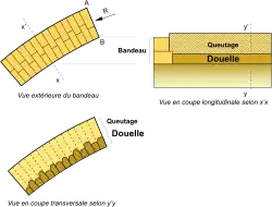 Les matériaux constitutifs de la douelle sont des moellons taillés avec une face rectangulaire, les quatre arêtes étant dans le même plan, et des côtés à faces convergentes, constituant ainsi un voussoir[1]. Il peut s’agir soit de moellons équarris, dénommés aussi « moellons tétués », à savoir dressés au marteau têtu, soit de moellons d’appareil, aussi dénommés « moellons smillés », c’est-à-dire taillés avec un nombre d'impacts plus important que la taille pointée et de façon plus régulière, avec des traits plus longs, selon la dureté de la roche[2]. L’utilisation de la pierre de taille est réservée aux bandeaux[1].