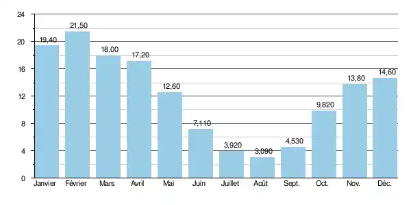 - Débit minimal (à Vabres-l'Abbaye) : 1,5 m3/s