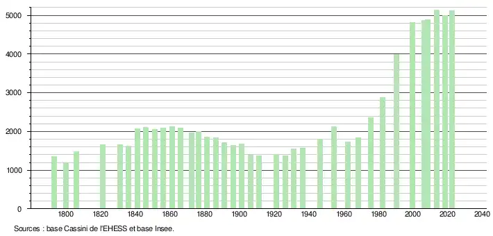 L'évolution du nombre d'habitants est connue à travers les recensements de la population effectués dans la commune depuis 1793. Pour les communes de moins de 10 000 habitants, une enquête de recensement portant sur toute la population est réalisée tous les cinq ans, les populations de référence des années intermédiaires étant quant à elles estimées par interpolation ou extrapolation[32]. Pour la commune, le premier recensement exhaustif entrant dans le cadre du nouveau dispositif a été réalisé en 2008[33].