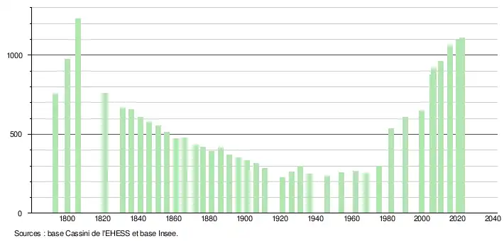 L'évolution du nombre d'habitants est connue à travers les recensements de la population effectués dans la commune depuis 1793. Pour les communes de moins de 10 000 habitants, une enquête de recensement portant sur toute la population est réalisée tous les cinq ans, les populations de référence des années intermédiaires étant quant à elles estimées par interpolation ou extrapolation[16]. Pour la commune, le premier recensement exhaustif entrant dans le cadre du nouveau dispositif a été réalisé en 2005[17].