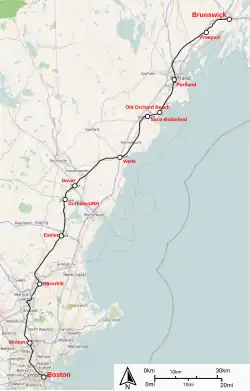 Le Downeaster emprunte des lignes appartenant à la Massachusetts Bay Transportation Authority (MBTA) entre la gare du nord de Boston et jusqu'à Haverhill. De là les lignes appartiennent à la Pan Am Railways et celles jusqu'à l'entrée de Brunswick où les voies menant à la gare appartiennent au Maine Department of Transportation (MaineDOT)[33]. Toutes ces lignes appartenaient à la Boston and Maine Corporation sauf une petite partie autour de Wilmington qui appartenait à la Boston and Lowell Railroad