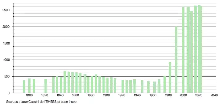 L'évolution du nombre d'habitants est connue à travers les recensements de la population effectués dans la commune depuis 1793. Pour les communes de moins de 10 000 habitants, une enquête de recensement portant sur toute la population est réalisée tous les cinq ans, les populations de référence des années intermédiaires étant quant à elles estimées par interpolation ou extrapolation[28]. Pour la commune, le premier recensement exhaustif entrant dans le cadre du nouveau dispositif a été réalisé en 2005[29].