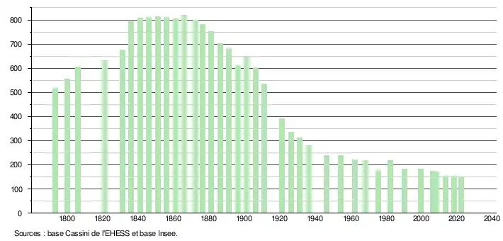 L'évolution du nombre d'habitants est connue à travers les recensements de la population effectués dans la commune depuis 1793. Pour les communes de moins de 10 000 habitants, une enquête de recensement portant sur toute la population est réalisée tous les cinq ans, les populations de référence des années intermédiaires étant quant à elles estimées par interpolation ou extrapolation[15]. Pour la commune, le premier recensement exhaustif entrant dans le cadre du nouveau dispositif a été réalisé en 2008[16].