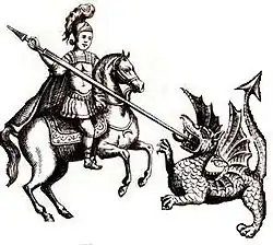 Selon La Légende dorée aussi, saint Georges tue un dragon qui terrifie les habitants de la ville de Silcha (Silène) en Libye et sauve une jeune fille des griffes de la bête[8].