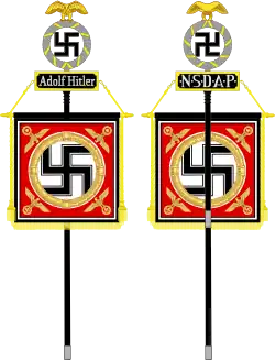 L'étendard est utilisé à toutes fins et consiste en un carré de matériau rouge dans différentes tailles réglementées. Au centre du carré se dresse un disque blanc, contenant une guirlande de feuilles de chêne dorées. Sur le disque blanc se trouve une croix gammée noire verticale. Dans chaque coin du champ rouge se trouve un emblème d'aigle de couleur or : dans le coin supérieur gauche et inférieur droit, un "Aigle du Parti", ou un "Aigle de la Wehrmacht" dans le coin supérieur droit et inférieur gauche. L'étendard entier était bordé sur les quatre côtés d'une bordure de bandes noires et blanches.