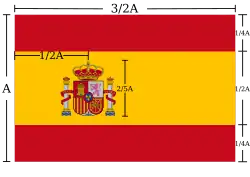 Le drapeau national espagnol, selon l'article 4.1 de la Constitution espagnole de 1978, est formé de trois bandes horizontales, rouge, jaune et rouge, la bande jaune étant deux fois plus large que chacune des deux bandes rouges. Sur la bande jaune, décalées vers la hampe, figurent les armoiries de l'Espagne.