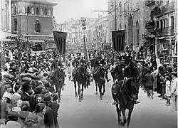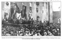 Sous la dictature de Primo de Rivera, tandis que le valencianisme politique était persécuté, le régionalisme culturel, dans sa version la plus conservatrice et la plus folkloriste, se trouva pleinement assumé par les institutions, constituant un avant-goût de ce qui serait le «regionalismo bien entendido» du franquisme. Un fait symptomatique est la reconversion de l'Hymne de l'exposition de 1909 en « Hymne régional »[62]. En janvier 1925, le maire de Madrid, nommé par le dictateur Miguel Primo de Rivera, appellait les ayuntamientos d'Espagne à se rendre dans la capitale pour y célébrer, au parc du Retiro, un acte de dédommagement («desagravio») pour le roi Alphonse XIII, attaqué par des exilés espagnols, dont le Valencien Vicente Blasco Ibáñez, pour avoir donné secondé le coup d'État de 1923. Le maire et les conseillers municipaux de Valence, tous nommés par le dictateur, assistèrent à la cérémonie en portant le drapeau couronné de la ville[63].