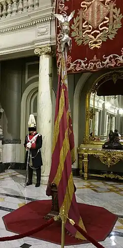 Après l'occupation de Valence par l'armée franquiste trois jours avant la fin de la guerre, les nouvelles autorités nommées par le Caudillo Francisco Franco décidèrent d'emporter le drapeau couronné avec elles à Madrid pour participer au grand défilé de la victoire franquiste (es), qui eut lieu dans la capitale espagnole le 19 mai 1939. Selon Orts, on ignore si le drapeau était un vainqueur du conflit ou un trophée de guerre[69]. Selon Esquilache et Baydal en revanche, « il fut exhibé comme un trophée de guerre, avec d'autres symboles tels que le drapeau de la Catalogne, l'ikurriña et le drapeau de la République[70]. »