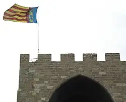 Les médiévistes Ferran Esquilache et Vicent Baydal notent également que le privilège de 1377 ne se réfère qu'aux armoiries de la ville, appliquées aux sceaux et aux armes municipales, et ils affirment qu'« on ne connaît aucun document du XVe siècle qui parle de la couronne ajoutée au drapeau. » Néanmoins, ils n'excluent pas cette possibilité et affirment qu'il est impossible de le savoir[24]. Viciano exclut totalement cette possibilité, argumentant que la couronne royale que Pierre le Cérémonieux avait accordée à la ville « ne se trouvait pas dans le champ de l'écu, mais était ce qu'en héraldique on appelle un timbre, un élément extérieur qui se superposait à l'écu royal, celui à quatre barres. Le problème était que, selon la réglementation régissant les drapeaux héraldiques, un timbre ne pouvait faire partie du drapeau de toile[25]. »