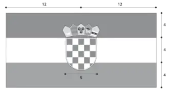 « Le drapeau de la république de Croatie se compose de trois couleurs : rouge, blanc et bleu avec les armoiries de la république de Croatie au milieu. Le rapport entre la largeur et la longueur du drapeau est de 1: 2. Les couleurs du drapeau sont disposées horizontalement dans cet ordre à partir du haut : rouge, blanc et bleu. Chaque couleur représente un tiers de la largeur du drapeau. Les armoiries de la république de Croatie sont situées au milieu du drapeau de sorte que la partie supérieure des armoiries (couronne) entre dans le champ rouge du drapeau et que la partie inférieure des armoiries entre dans le champ bleu du drapeau. Le point central des armoiries coïncide avec le point d'intersection des diagonales du drapeau. »