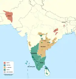 Pour la plupart, elles sont concentrées dans la moitié sud de la péninsule indienne, mais deux exceptions existent dans le nord : les Brahouis au nord-ouest et les Kurukhs et Maltos au nord-est[2]. D'autres locuteurs d'une langue dravidienne, le tamoul, vivent au Sri Lanka. Les plus nombreux peuples dravidiens (30-70 millions de personnes chacun) sont les Télougous, les Tamouls, les Kannadigas et les Malayalis. Il existe de plus petites communautés (de 1 à 5 millions de locuteurs) au Pakistan et dans le centre de l'Inde.