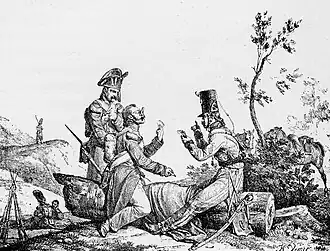 - ↑ Cette lithographie est la première d'une suite de trois ; la deuxième intitulée Les Suites du jeu de la drogue montrent deux soldats faire le « coup de torchon » (règlement de comptes en duel, ici à l'épée mouchetée), et la troisième appelée La Réconciliation représente deux soldats s'embrassant en entrant dans un débit de boisson où un homme verse le vin à côté de son verre.