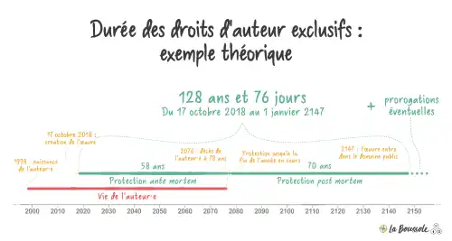 La durée des droits patrimoniaux couvre la vie de l'auteur. À la mort de l'auteur, ces droits persistent au bénéfice de ses ayants droit pendant l'année civile en cours et les soixante-dix années qui suivent[23] (cinquante ans avant la loi du 27 mars 1997).
