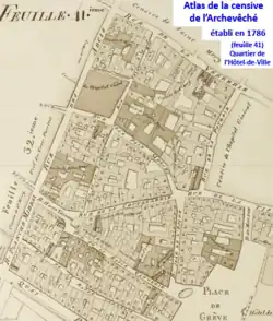 Dans les dernières années de l'Ancien Régime, l'Archevêché de Paris fait dresser dans les années 1780 un plan-terrier très détaillé de sa censive publié en 1786 pour établir ses droits. Ce document de caractère cadastral d'une extrême précision permet de connaître les limites de la plupart des censives de Paris, généralement très enchevêtrées, certaines minuscules, et indique le nom des propriétaires dans chaque rue sur la majorité du territoire de la ville. Certains quartiers éloignés du domaine de l'Archevêché ne sont cependant pas représentés[10]. Cet ouvrage ainsi que certaines tentatives de perceptions de droits tombés en désuétude s'inscrit dans le mouvement de réaction féodale qui a précédé la Révolution.