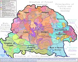 Selon l'historien roumain Ioan-Aurel Pop, à la fin du XIIIe siècle, environ quarante comtés roumains sont enregistrés en Hongrie orientale et Transylvanie, de la Marmatie au nord jusqu'au banat de Severin au sud. Ces comtés comprenaient les terres des nobles roumains orthodoxes « tolérés » (tolerati), assimilés de barons (le rang nobiliaire le plus modeste), car seuls les nobles magyars catholiques étaient reçus nobles à part entière (recepti). Les tolerati étaient obligés de payer des droits aux recepti à moins de se convertir au catholicisme[46]. Toutefois les devoirs des « tolérés » (montant du tribut, nombre de guerriers à fournir, fantassins ou cavaliers) variaient selon les conditions spécifiques dans lesquelles leurs ancêtres avaient été soumis par les Magyars[47]. Persécutés chez eux après l'édit de 1366, de nombreux roumains, nobles ou roturiers, ont fui des comtés transylvains de Bârsa, Făgăraș, Sibiu, Hunyad et Hațeg, ainsi que des comtés banatéens de Vâlcu / Valkó, de Caraș-Severin / Krassó-Szörény et du Timiș vers le banat de Severin où les orthodoxes étaient tolérés mais tenus de fournir un tribut et des troupes à la couronne de Hongrie.