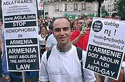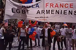 En octobre 2004, l'Association des gays et lesbiennes arméniens de France (AGLA France) organise une manifestation et se poste devant l'ambassade d'Arménie à Paris pour dénoncer la campagne homophobe et le dénigrement des personnes LGBT par des législateurs et des médias arméniens. La lettre ouverte de l'association au président d'Arménie est publiée quelques jours plus tard dans le journal Haykakan Zhamanak.