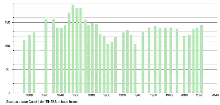 L'évolution du nombre d'habitants est connue à travers les recensements de la population effectués dans la commune depuis 1793. Pour les communes de moins de 10 000 habitants, une enquête de recensement portant sur toute la population est réalisée tous les cinq ans, les populations de référence des années intermédiaires étant quant à elles estimées par interpolation ou extrapolation[22]. Pour la commune, le premier recensement exhaustif entrant dans le cadre du nouveau dispositif a été réalisé en 2006[23].