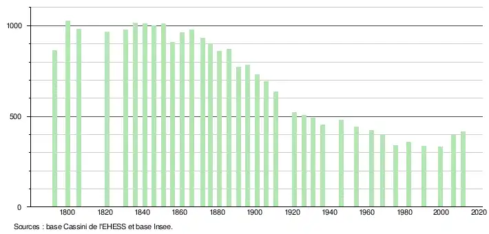 - ↑ Par convention dans Wikipédia, le principe a été retenu de n’afficher dans le tableau des recensements et le graphique, pour les populations légales postérieures à 1999, que les populations correspondant à une enquête exhaustive de recensement pour les communes de moins de 10 000 habitants, et que les populations des années 2006, 2011, 2016, etc. pour les communes de plus de 10 000 habitants, ainsi que la dernière population légale publiée par l’Insee pour l'ensemble des communes.