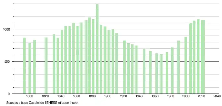 L'évolution du nombre d'habitants est connue à travers les recensements de la population effectués dans la commune depuis 1793. Pour les communes de moins de 10000habitants, une enquête de recensement portant sur toute la population est réalisée tous les cinqans, les populations de référence des années intermédiaires étant quant à elles estimées par interpolation ou extrapolation[22]. Pour la commune, le premier recensement exhaustif entrant dans le cadre du nouveau dispositif a été réalisé en 2005[23].