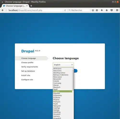 Drupal se chargeait en anglais et il revenait à l'installateur de télécharger et d'activer les messages en français. Cette opération est dorénavant prise directement en charge par l'installeur. Il suffit de choisir la langue souhaitée dans un menu déroulant.