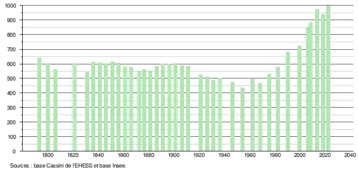 L'évolution du nombre d'habitants est connue à travers les recensements de la population effectués dans la commune depuis 1793. Pour les communes de moins de 10 000 habitants, une enquête de recensement portant sur toute la population est réalisée tous les cinq ans, les populations de référence des années intermédiaires étant quant à elles estimées par interpolation ou extrapolation[26]. Pour la commune, le premier recensement exhaustif entrant dans le cadre du nouveau dispositif a été réalisé en 2008[27].