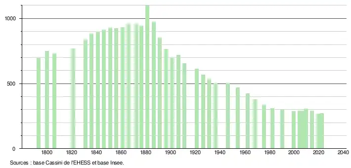 L'évolution du nombre d'habitants est connue à travers les recensements de la population effectués dans la commune depuis 1793. Pour les communes de moins de 10 000 habitants, une enquête de recensement portant sur toute la population est réalisée tous les cinq ans, les populations de référence des années intermédiaires étant quant à elles estimées par interpolation ou extrapolation[17]. Pour la commune, le premier recensement exhaustif entrant dans le cadre du nouveau dispositif a été réalisé en 2004[18].