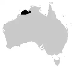 Cette espèce est endémique du Nord-Ouest de l'Australie. Elle se rencontre jusqu'à 600 m d'altitude dans la région de Kimberley en Australie-Occidentale et dans le Nord-Ouest du Territoire du Nord[1],[2]. La zone de répartition de l'espèce est d'environ 119 900 km2[2].