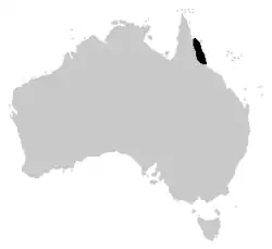 Cette espèce est endémique du Queensland en Australie. Elle se rencontre le long de la côte Nord entre Cooktown et Townsville, entre 100 et 1 500 m d'altitude[1]. La zone de répartition de l'espèce est d'environ 19 600 km2[2].