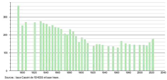 L'évolution du nombre d'habitants est connue à travers les recensements de la population effectués dans la commune depuis 1793. Pour les communes de moins de 10 000 habitants, une enquête de recensement portant sur toute la population est réalisée tous les cinq ans, les populations de référence des années intermédiaires étant quant à elles estimées par interpolation ou extrapolation[21]. Pour la commune, le premier recensement exhaustif entrant dans le cadre du nouveau dispositif a été réalisé en 2006[22].