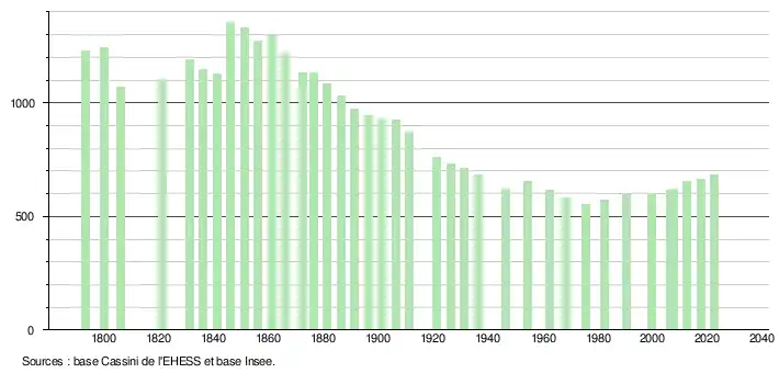 L'évolution du nombre d'habitants est connue à travers les recensements de la population effectués dans la commune depuis 1793. Pour les communes de moins de 10 000 habitants, une enquête de recensement portant sur toute la population est réalisée tous les cinq ans, les populations de référence des années intermédiaires étant quant à elles estimées par interpolation ou extrapolation[21]. Pour la commune, le premier recensement exhaustif entrant dans le cadre du nouveau dispositif a été réalisé en 2007[22].
