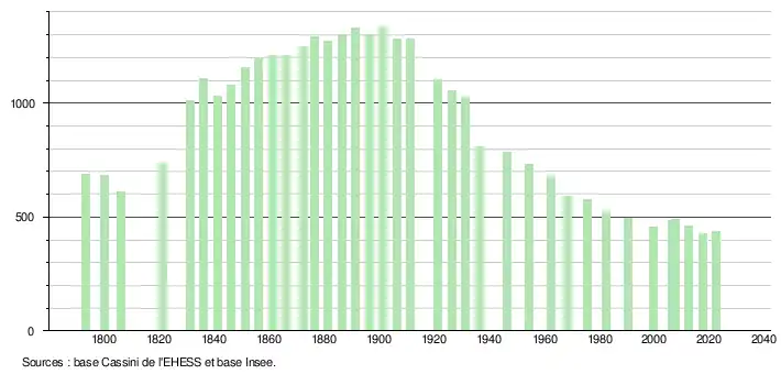 L'évolution du nombre d'habitants est connue à travers les recensements de la population effectués dans la commune depuis 1793. Pour les communes de moins de 10 000 habitants, une enquête de recensement portant sur toute la population est réalisée tous les cinq ans, les populations de référence des années intermédiaires étant quant à elles estimées par interpolation ou extrapolation[32]. Pour la commune, le premier recensement exhaustif entrant dans le cadre du nouveau dispositif a été réalisé en 2007[33].
