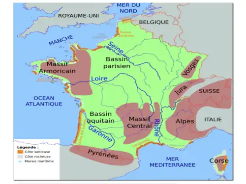 Du Sud de la Bretagne au Sud des Landes, se développe en France, sur environ 500 kilomètres, le plus grand complexe dunaire au niveau européen[28]. Le système de type aquitain présente des dunes de gros volumes et se développe presque en continu sur plus de 250 kilomètres de Biarritz à l'île d'Oléron. Le système de type vendéen et breton comprend des dunes de plus faibles volumes et entrecoupées de côtes rocheuses[28].