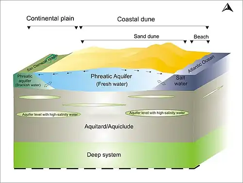 - ↑ L'infiltration directe des eaux de pluie à travers les sables dunaires perméables est la principale source d'alimentation des nappes d'eau souterraine côtières formées dans les dépressions interdunaires et pouvant être occupées par des zones humides ((lagunes, marais salants, marais d’eau douce/saumâtre). Cf (en) T.Dincer,A.Al-Mugrin, U.Zimmermann, « Study of the infiltration and recharge through the sand dunes in arid zones with special reference to the stable isotopes and thermonuclear tritium », Journal of Hydrology, vol. 23, nos 1–2, , p. 79-109 (DOI 10.1016/0022-1694(74)90025-0)