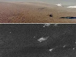 Des formations identifiées comme des champs de dunes ont aussi été photographiées sur la comète 67P/Tchourioumov-Guérassimenko[29] et sur la planète naine Pluton[30],[31], malgré la faiblesse attendue des vents sur ces deux objets. Les dunes de Pluton sont constituées de méthane solide (des cristaux de 200 à 300 µm de diamètre)[32],[31].