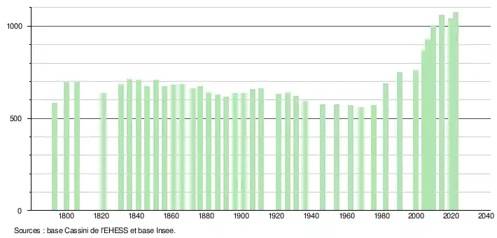 L'évolution du nombre d'habitants est connue à travers les recensements de la population effectués dans la commune depuis 1793. Pour les communes de moins de 10 000 habitants, une enquête de recensement portant sur toute la population est réalisée tous les cinq ans, les populations de référence des années intermédiaires étant quant à elles estimées par interpolation ou extrapolation[18]. Pour la commune, le premier recensement exhaustif entrant dans le cadre du nouveau dispositif a été réalisé en 2004[19].