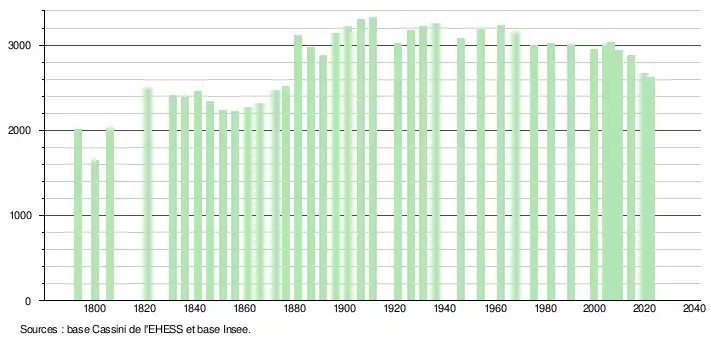 L'évolution du nombre d'habitants est connue à travers les recensements de la population effectués dans la commune depuis 1793. Pour les communes de moins de 10 000 habitants, une enquête de recensement portant sur toute la population est réalisée tous les cinq ans, les populations de référence des années intermédiaires étant quant à elles estimées par interpolation ou extrapolation[28]. Pour la commune, le premier recensement exhaustif entrant dans le cadre du nouveau dispositif a été réalisé en 2004[29].