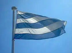 Le drapeau de Dunkerque est argent fascé d'azur, c'est-à-dire sur un fond blanc se trouvent trois bandes bleues, la bande la plus basse étant bleue. L'histoire de ce drapeau est peu connue: sous la domination espagnole, la marine dunkerquoise a un pavillon qui lui est propre. En 1662, alors que Dunkerque devient définitivement française, le roi Louis XIV honore les corsaires dunkerquois en leur offrant un pavillon particulier afin de favoriser la course sur mer. Délivré le , il est alors blanc chargé d'une croix bleue en son centre[Note 23]. Durant le siècle suivant, les Dunkerquois conservent deux pavillons: le premier bleu et blanc, et le second qui est une croix rouge sur fond blanc. Le , le drapeau de Dunkerque est remplacé par décret officiel par le pavillon de Cherbourg, qui est blanc orné de deux bandes bleues. Au fil des temps, le drapeau porte une bande en plus et devient celui que l'on connaît aujourd'hui[230].
