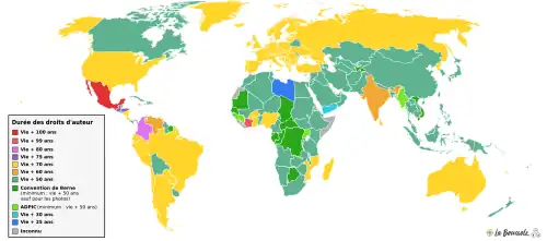 | Convention de Berne pour la protection des œuvres littéraires et artistiques signataires | Vie + 50 ans[68] Les signataires peuvent accorder des durées plus longues[69] |