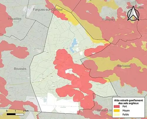 Le retrait-gonflement des sols argileux est susceptible d'engendrer des dommages importants aux bâtiments en cas d’alternance de périodes de sécheresse et de pluie[21]. 33,9 % de la superficie communale est en aléa moyen ou fort (91,8 % au niveau départemental et 48,5 % au niveau national)[Carte 2]. Depuis le , en application de la loi ELAN, différentes contraintes s'imposent aux vendeurs, maîtres d'ouvrages ou constructeurs de biens situés dans une zone classée en aléa moyen ou fort[Note 3],[22].