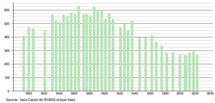 L'évolution du nombre d'habitants est connue à travers les recensements de la population effectués dans la commune depuis 1793. Pour les communes de moins de 10 000 habitants, une enquête de recensement portant sur toute la population est réalisée tous les cinq ans, les populations de référence des années intermédiaires étant quant à elles estimées par interpolation ou extrapolation[24]. Pour la commune, le premier recensement exhaustif entrant dans le cadre du nouveau dispositif a été réalisé en 2007[25].